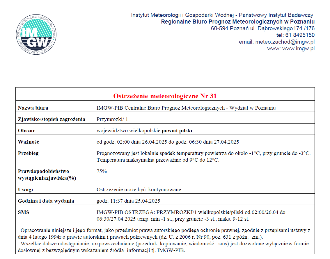 IMGW ostrzega: temperatura może spaść poniżej 0 stopni Celsjusza. Prognozowany jest lokalnie spadek temperatury powietrza do około -1°C, przy gruncie do -3°C. Temperatura maksymalna przeważnie od 9°C do 12°C. Komunikat z ostrzeżeniem obowiązuje od godziny 2.00 w sobotę 26 kwietnia do godziny 6.30 w niedzielę 27 kwietnia.
